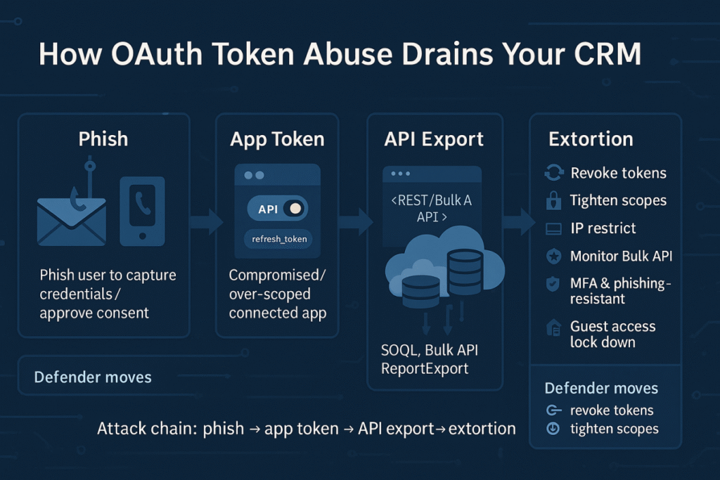 Salesforce concentrates prospect, customer, and support data—exactly what fuels targeted phishing and fraud campaigns at scale. Once pulled, it’s easy to monetize and hard for victims to “revoke.” This is why adversaries favor “legitimate” channels like OAuth/API over noisy web scraping. TechRadar